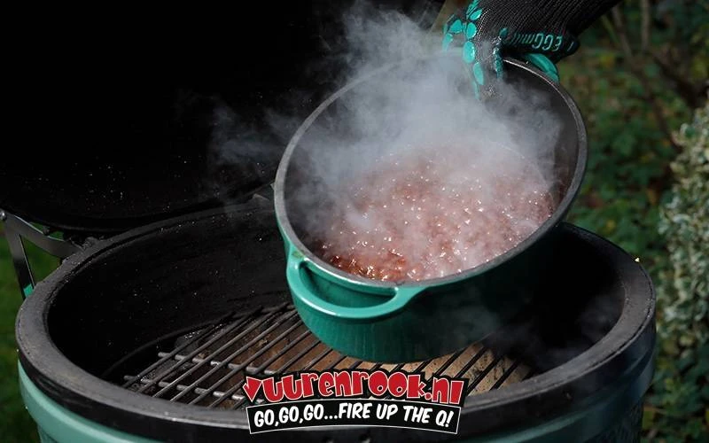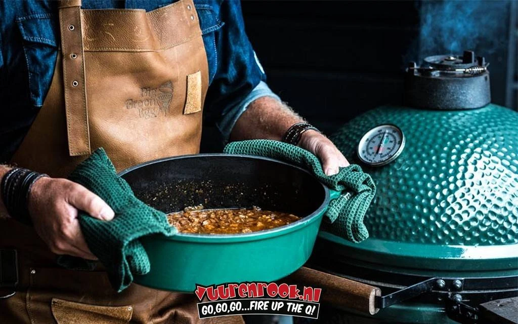 De Green Dutch Oven voor de Big Green Egg is met recht een zware jongen. Deze geëmailleerde gietijzeren braadpan stooft, suddert, kookt, bakt en braadt. Een echte allrounder dus! Je kunt de deksel van de Green Dutch Oven apart gebruiken als ondiepe bakpan of als vorm voor cakes en desserts. De Green Dutch Oven is rond en ovaal beschikbaar.