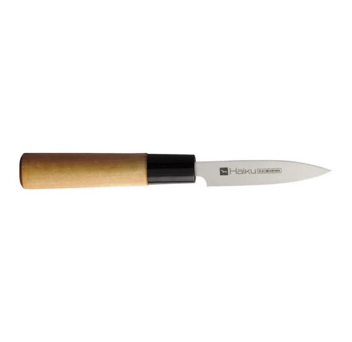 Officemes met een grootte van 8 cm. Perfect voor het snijden of schillen van fruit, groenten, paddestoelen, enz. Het handvat is gemaakt van behandeld Honoki hout: dit is de schorslaag van een houtsoort verwant aan de magnolia die quasi onbederfelijk en ondoordringbaar is. Het handvat is bevestigd aan het lemmet met een spie: dit zorgt voor een zeer stevige montage.