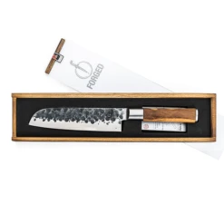 De kern van deze speciale messen bestaat uit een flinterdunne laag hooggelegeerd “Double X VG 12” koolstofstaal met een extreme hardheid van meer dan 61° HRC. Dit maakt het snijden bijzonder efficiënt en verlengt de levensduur aanzienlijk van de snijkant. Deze kern is ingeklemd tussen lagen voedselveilig roestvrij staal. Handvat gemaakt van pruimeboom hout.