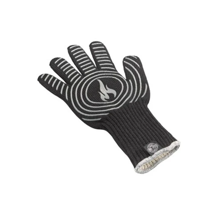 De grillhandschoen biedt een veilige bescherming tegen de hitte en extra grip door het silicone patroon.