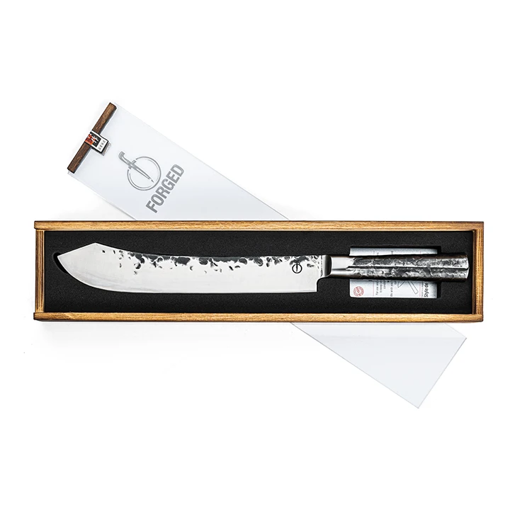 Het merk Forged staat voor een bijzondere en opvallende koksmessencollectie. Door het bijzondere uiterlijk, de mooie verpakking en het volledige handwerk zal dit menig messenliefhebber zijn hart sneller doen laten kloppen. 100% handgesmeed, verpakt in bijzonder gebrand houten kistje. Ieder mes is een UNIEK stuk! Verpakt in een luxe houten kist. NIET vaatwasmachinebestendig. Direct na het afwassen drogen met een doek.