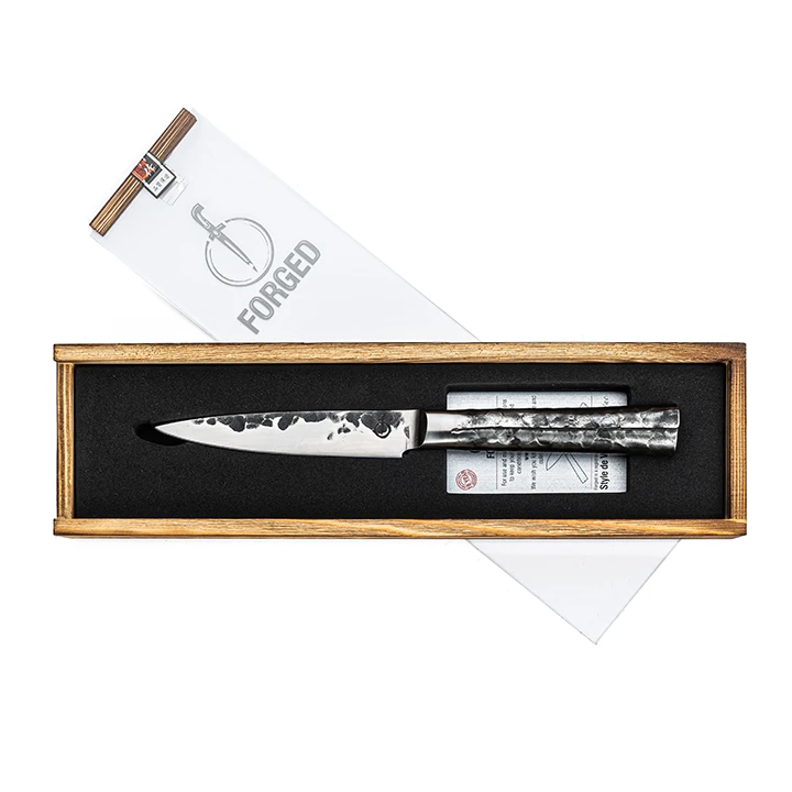 Het merk Forged staat voor een bijzondere en opvallende koksmessencollectie. Door het bijzondere uiterlijk, de mooie verpakking en het volledige handwerk zal dit menig messenliefhebber zijn hart sneller doen laten kloppen. 100% handgesmeed, verpakt in bijzonder gebrand houten kistje. Ieder mes is een UNIEK stuk! Verpakt in een luxe houten kist. NIET vaatwasmachinebestendig. Direct na het afwassen drogen met een doek. De Forged en Intense Forged messen collectie is verkrijgbaar als losse messen of als 6-delige messenset. De collectie bestaat uit een: Koksmes, Universeel mes, Hakbijl, Broodmes, Vleesmes, Schilmes.