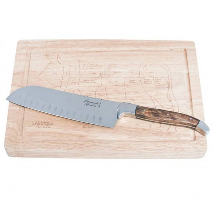 Laguiole Santoku (olijf houten handvat) inclusief snijplank Rund.Een ideale starter set voor iedereen die wilt overstappen naar betere messen. Deze set bestaat uit een Laguiole Santokumes en een snijplank. De santoku is een echte alleskunner en is geschikt voor groenten, fruit, vlees en vis.