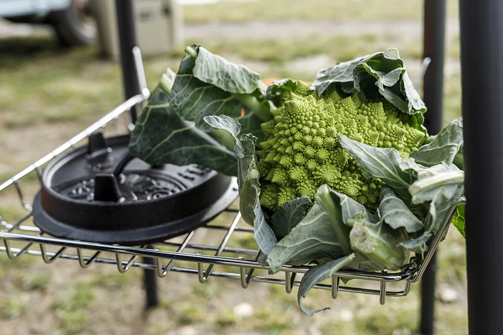 Op 40 x 40 cm kun je ook wat apparatuur opbergen voor je vuur- en kookplaats. Tegelijkertijd houdt de verhoogde rand van 4 cm uw keukengerei goed op zijn plaats. Nog een voordeel: de verchroomde stalen bak is niet alleen robuust: hij heeft een laadvermogen tot 15 kg en dient ook als opslagruimte voor uw Dutch Oven of gietijzeren of smeedijzeren pan. Op deze manier hebt u uw handen vrij om briketten te verwisselen of uw vuur opnieuw te ontsteken.