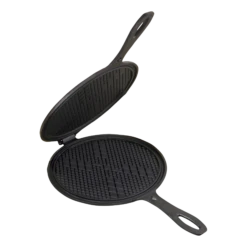 Gietijzeren stroopwafelijzer met handvat. Bestaande uit twee demontabele zijden. Tijdens het bakken eenvoudig om te draaien zodat de wafel aan beide zijden bruin wordt.