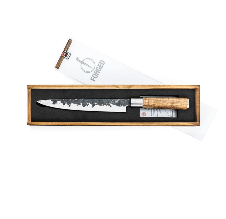 Het ontwerp en design van de VG10 serie van Forged is ontstaan met inspiratie vanuit het messenland bij uitstek; Japan. Dit zie je onder andere terug in de overgang van het lemmet naar het heft. Deze serie is vernoemd naar de staalsoort die is gebruikt voor het lemmet. Het Japanse VG10 staal zorgt voor een aangename hardheid van maar liefst 60 Rockwell. De messen zijn in 5 lagen gesmeed, dit zorgt in subtiele mate voor die typische uitstraling zoals je dit ook bij damastmessen ziet. Door deze technieken is scherpheid en snijcomfort verzekerd. De messen hebben een bijzonder heft gemaakt van luxueus wortelhout. De luxe geschenkverpakking maakt het plaatje helemaal compleet.